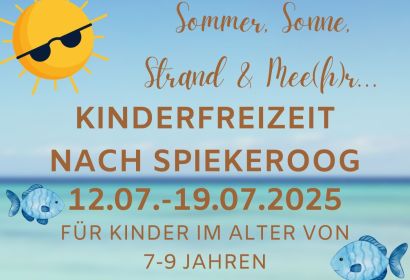 Kinderfreizeit 2025 „Sommer, Sonne, Strand & Mee(h)r“ Die evangelischen Kirchengemeinden der Wedemark laden ein zu einer Kinderfreizeit vom 12.-19. Juli 2025 für Kinder im Alter von 7 bis 10 Jahren auf die Nordseeinsel Spiekeroog.